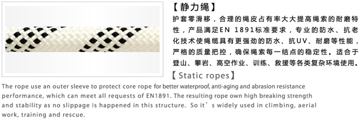 護(hù)套零滑移,合理的繩皮占有率大大提高繩索的耐磨特性,產(chǎn)品滿足EN1891標(biāo)準(zhǔn)要求,專業(yè)的防水,抗老化技術(shù)使繩纜具有更強(qiáng)勁的防水、抗UV,耐磨等性能,嚴(yán)格的質(zhì)量把控,確保繩索每一個(gè)結(jié)點(diǎn)的穩(wěn)定性。適合于登山、攀巖、高空作業(yè)、訓(xùn)練、救援等各類復(fù)雜環(huán)境使用。